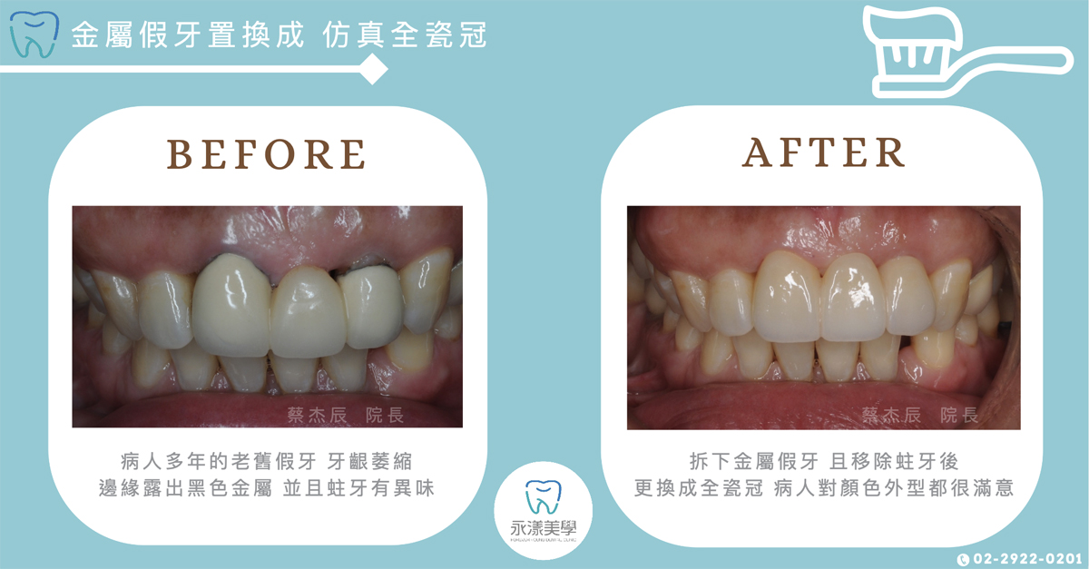 相較於傳統的金屬假牙,全瓷冠克服了金屬假牙常造成的牙齦染色及邊緣黑不自然的問題。不僅對於牙齦有極高的組織相容性,亦可模擬鄰近自然牙表面質地與色調結構,模擬出自然牙的仿真通透感。